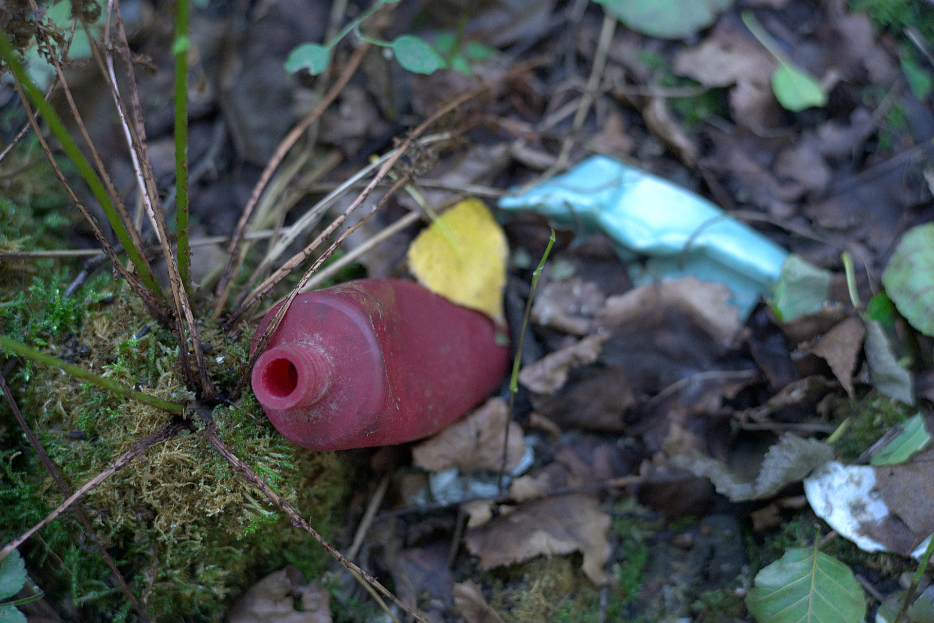 Hervortretender Hausmüll am Rand der ehemaligen Deponie Eller Forst, Düsseldorf
