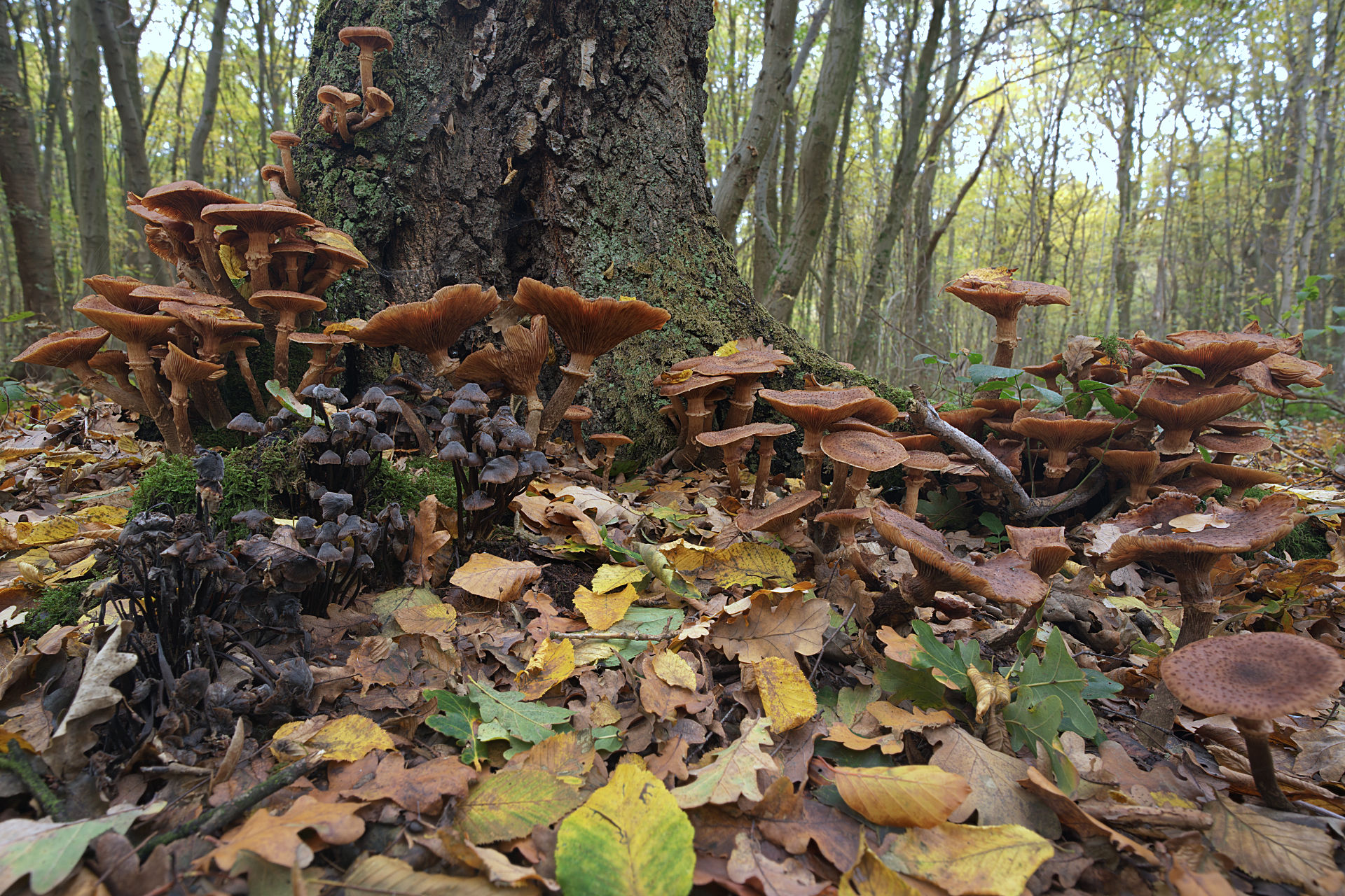 Dunkle Hallimasch (Armillaria ostoyae) und Rillstieliger Helmling (Mycena polygramma), Eller Forst, Düsseldorf; gestapelter Fokus aus 10 Belichtungen (Beschnitt -0,05)